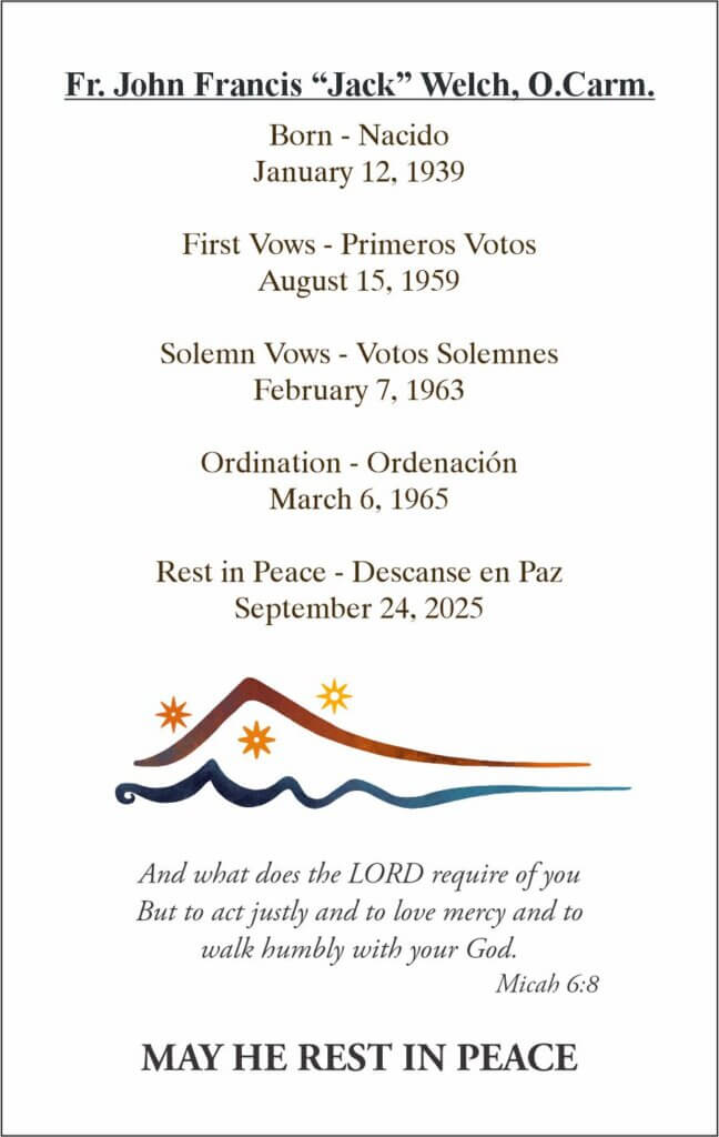 Rev. John Francis “Jack” Welch, O.Carm., died on September 24, 2025, at Holy Family Medical Center in Des Plaines, Illinois. He was 86 years old. A visitation is scheduled at the National Shrine of St. Therese in Darien, Illinois, beginning at 4:00 PM, Thursday, October 2, 2025, followed by the Funeral Mass at 7:00 PM. Interment will take place at 10:00 AM, Friday, October 3, 2025, at Mount Olivet Cemetery in Chicago, Illinois.