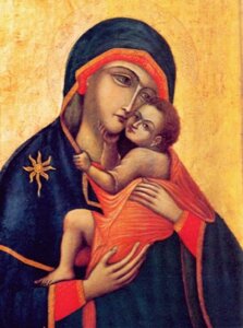 The stars on Our Lady’s outer garment represent the three persons in the Trinity.  The top represents God, the Father.  The star on her left shoulder represents the Holy Spirit.  On Mary’s right shoulder is the baby Jesus, where the star would be positioned.  In the Eastern Orthodox Rite, the sign of the cross is from above to below, and from right to left.
